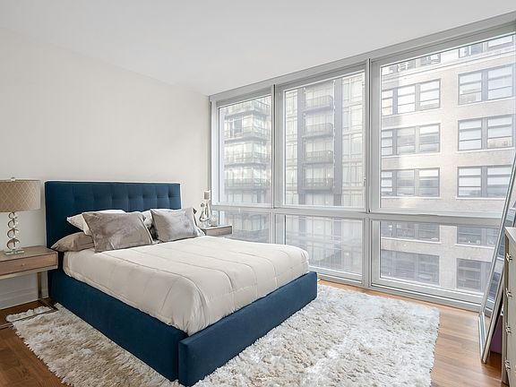 With floor-to-ceiling windows spanning its entire width, the apartment enjoys excellent light all day long. The living room has custom sun shades, and the bedroom has custom sun and blackout shades, plus double-paned windows.
