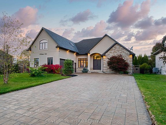 Unique custom-built 3+2 beds, 4.5 baths ranch-style bungaloft located in desirable Kilworth Heights. This open-concept quality home offers approximately 5,000 sq.ft. of finished living space, featuring premium flooring throughout and ceramic tiles in all wet areas. Master and second bedroom conveniently located on the main floor, plus a spacious guest suite on the upper loft level with wired for surround sound, projector and speakers for use of theatre room as well - all 3 bedrooms above grade feature private ensuites for ultimate comfort and privacy. This property boasts rounded corner drywall beads, pot lights throughout, floating hardwood staircase. Southeast-facing front allows abundant natural light all day long. The main floor boasts soaring 14-foot peak cathedral ceilings, built-in speakers, large transom light windows and a cozy gas fireplace accented by an impressive stone feature wall - combining warmth, elegance, and modern design. Chef's kitchen featuring custom maple cabinetry, granite countertops, large breakfast bar with stone accents, and high-quality built-in stainless steel appliances including a gas cooktop. The fully finished lower level provides 2 more bedrooms, a large recreation area with a wet bar, mini-fridge, and electric fireplace, as well as a spa-like bathroom with soaking tub and glass shower. Oversized cold room and ample storage space. Step outside to a beautifully landscaped fenced backyard with a 17x10ft covered patio, built-in speakers and gas BBQ hookup, perfect for year-round enjoyment. Stamped driveway fits 8-10 vehicles. Close to parks, trails, schools, and just minutes to London's west end amenities. A true must-see custom home combining luxury, comfort, and functionality in one of Kilworth's most sought-after neighbourhood.