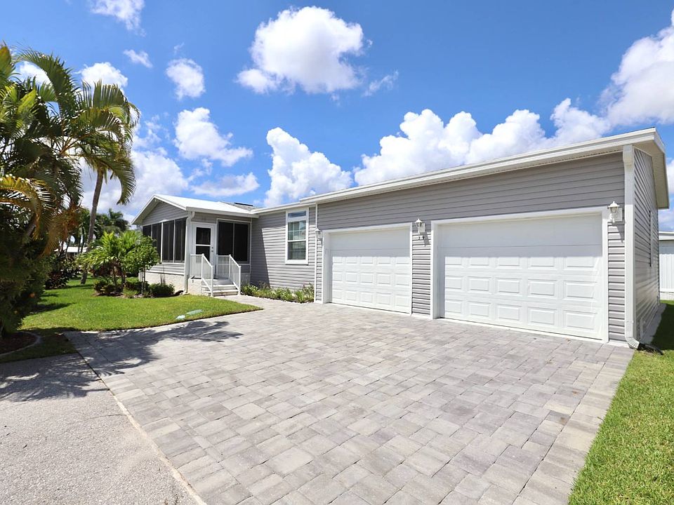 TAKE NOTICE OF THE PRICE DROP-MOTIVATED SELLER! You can begin enjoying the Florida lifestyle in this beautiful home with all the upgrades imaginable. The primary suite has a large walk-in closet and wonderful bathroom with plenty of storage, a tiled shower & double vanity. The other two bedrooms are separate from the primary suite and also have large closets and a full bath in the hall. There are extra cabinets in the hallway for linens. The kitchen, dining & living area are open and spacious. The center island gives you plenty of extra space for entertaining or to use for food preparation. The state-of-the-art kitchen offers white & gray cabinetry, stainless steel appliances, farm sink, pantry & tons of counter space. You will love the stackable washer & dryer and storage in the laundry area. The oversized two-car garage is just an added bonus to this beauty. Outdoors you will fall in love with the brick driveway, beautiful landscaping and back patio. The minute you step into the enclosed lanai you will feel right at home. This 2023 model is tucked at the end of the cul-de-sac and offers lots of privacy. Come take a look at this furnished home in Jamaica Bay Village, a 55+ land leased community in South Fort Myers. Jamaica Bay has lots of activities such as exercise classes, monthly entertainment & shows, pool parties, card games, social gatherings, etc. The amenities include pickleball, tennis, pools, hot tub, bocce, shuffleboard, library, billiards and gym. Jamaica Bay is very conveniently located and close to shopping, beaches, restaurants, medical facilities and RSW international airport.