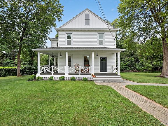Situated on 1/2 an acre surrounded by trees, you will have plenty of privacy, while only being 1 mile from the center of town where you can enjoy shops, restaurants, the public library, and so much more. The open floorplan will welcome entertaining, as will the stunning kitchen design with stainless appliances, a center island, and carrara marble countertops. The 2nd floor brings you 3 spacious bedrooms, one with a full en suite bath, as well as a full hall bath. There is an additional half bath on the main level. Outside you will have the option of sipping your coffee on your wrap-around rocking chair front porch, or enjoying an evening cocktail on your back deck while overlooking your level lawn. In addition to the 1,730 square feet of living space, there is also a full basement, a walk-up attic, and a detached garage.