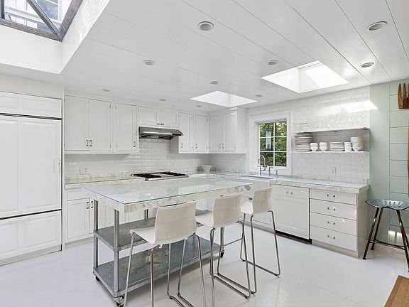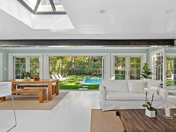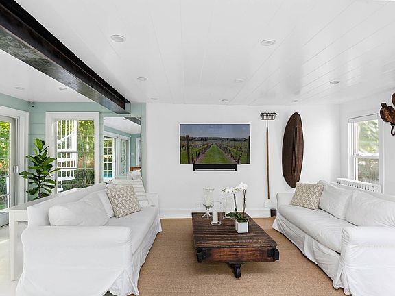 A quintessential Sag Harbor Village historic home with an inviting front porch, this turn-of-the-century home has been recently renovated and updated by noted builder and designer Ray Romano. A traditional entry hall with a graceful original staircase opens into an airy, open-concept layout that seamlessly connects the kitchen, dining, and living areas, all of which overlook the backyard through dramatic bi-fold doors that open the entire rear of the home to the pool and lawn, creating the ultimate indoor-outdoor entertaining experience. The main level is awash with natural light from four expansive skylights, filling the space with warmth and brightness. The first floor includes a bedroom and full bath, along with a hallway closet discreetly concealing the washer and dryer. Upstairs, two generously sized bedrooms share a beautifully appointed bathroom finished in Carrara marble and classic subway tile. One bedroom also opens onto a spacious rooftop deck, complete with a sitting area and putting green. The deck can also be accessed by an outdoor staircase from the back lawn, offering a spectacular extension of the home's entertaining space. Located on a Village street with just a few other homes and very little traffic, 39 Hamilton is an incredible value for its quiet location, ample size, and updated condition.