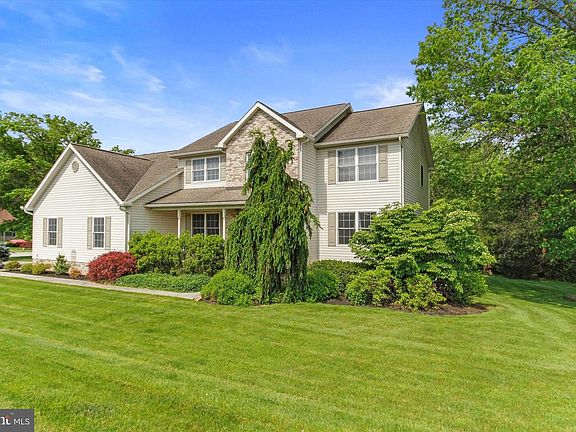Fabulous 3,006 sq ft, 2-story home with 2-car side entry insulated & vented garage in Hunters Crossing (a sidewalk development) just minutes from US 15 corridor for PA & MD commuters and just a hop skip and a jump from Historic Downtown Gettysburg, PA. Situated nicely on a corner lot and backing to woods, the rear multi-tiered deck and paver patio with fire pit offer views of the fishpond and woods, while providing privacy and shade. This expansive open floor plan; 4 bedrooms, 2.5 baths (formerly used as a model home) boast a 1st floor primary bedroom suite, with walk in closet, jacuzzi jetted tub and walk in shower, 1st floor laundry room, 2-story great room with gas fireplace, windows with custom electric blinds, 2-story front foyer, dining room and office with wood flooring, kitchen with newer stainless-steel appliance, breakfast nook, center island, pantry, bay bump out, and cherry cabinetry. 3 Generously sized 2nd floor bedrooms, spacious lower level walk out 684 sq ft rec room with climbing wall, 8' ceilings and pellet stove. Well maintained, recently painted and recarpeted! This property also includes a front covered porch, lush landscaping, lower level 741 sq ft unfinished storage room, central vacuum, and gas water heater. Wonderful Spaces, Come See!