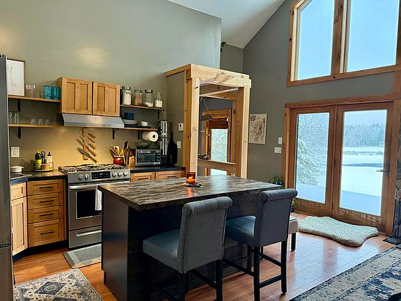 Inside, the home blends warmth and functionality. The main living area features a wood-burning fireplace and an open kitchen and living space perfect for hosting and gathering. Downstairs, you'll find a cozy entertainment area with a projector screen and wood stove, ideal for movie nights or relaxing after a day outdoors. The basement workshop and storage space offer excellent versatility, while a mini bar area and full laundry room add convenience. There is also potential for a third bathroom, enhancing future flexibility.