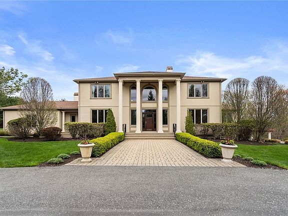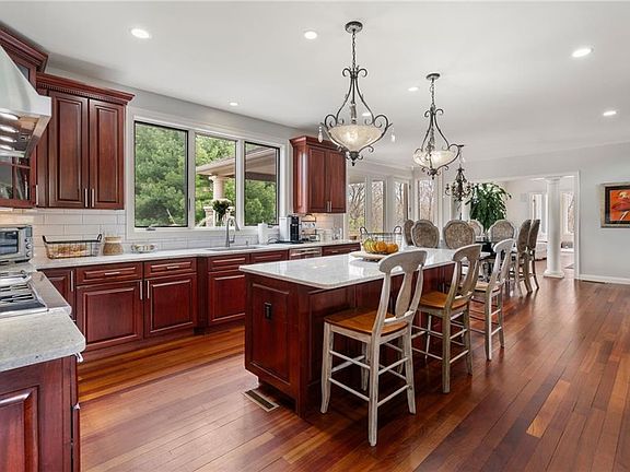 Escape into your own exclusive residence. This exceptional 4 Bedroom mini estate is located at the end of a private road, approached by an expansive circular driveway. The ultimate in privacy set on 8+ superb acres approaching perfection. This 10 room sun-filled home offers a well designed layout ideal for easy living and entertaining. The primary suite with jacuzzi is separate and apart from the other bedrooms. Grand doors off the eat-in kitchen lead to a mahogany deck, stone patio and built in fireplace, perfect for outdoor gatherings. The the lower level offers more living space with a rec room, kitchen and bath. Walk out to an additional outdoor living space with easy access to the pool area or relax in the shaded patio and watch TV! Underground sprinklers, generator, 3 car garage. Easy access to main roads and shopping. Propane gas for cooking and living room fireplace.