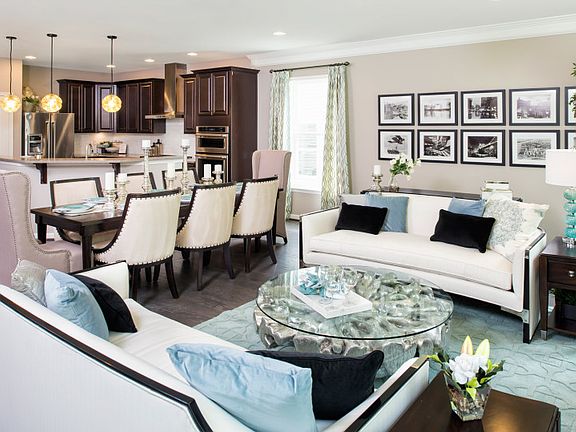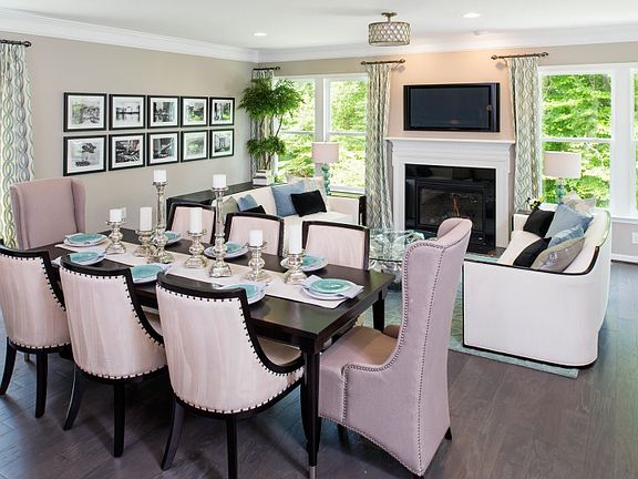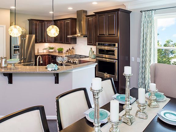 Charming farmers porch welcomes you into this sun-drenched home & to view of rear wall of Gathering Room with its center fireplace & two oversized windows to either side. Upgraded kitchen open to Gathering Room. Exceptional wooded homesite.