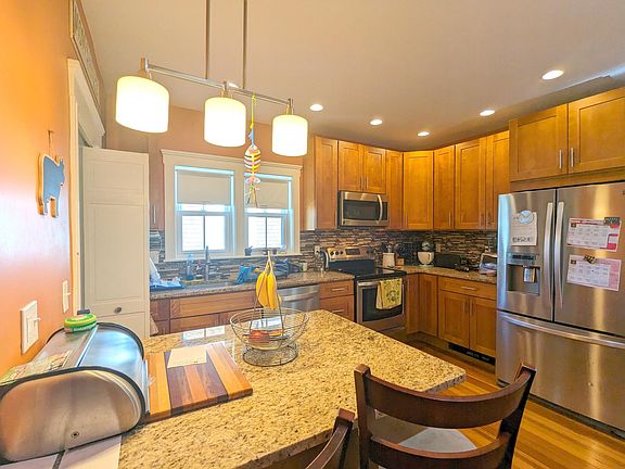 Sunny renovated unit on the top two floors of a house. Private entrance with a small foyer. Modern peninsula kitchen with granite counters and stainless steel appliances. There's a pantry for extra storage and laundry in unit. Spacious living and dining rooms with bay windows. Renovated bathroom with tub and a tile floor. Front and back porches just for this unit! Upstairs on the third floor are 3 large bedrooms with great closet space and a second full bathroom. Great back yard! The whole driveway is included with this unit and can fit 3 cars. One cat negotiable. Available September 1. Owner pays for cold water & sewer, tenants pay for electricity and heating oil. Three off street parking spaces included. No broker fee.