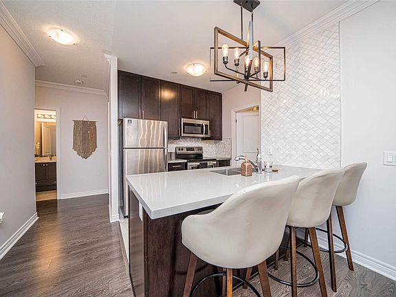Absolutely Stunning! This Prestigious Green Life Building Condo Unit In High Demand Markham Area. Rarely Offered 3 Bed & 2 Full Bath Penthouse Suite. Open Concept Living & Dining Features W/Engineered Floor, 9' Ceilings, Upgraded Kitchen With Extended Cabinets And Pantry, S/S Appliances, Quartz Countertop And Ceramic/Backsplash. Steps To Ttc & Yrt! Walking Distance To Costco, Shoppers, Homedepot, Canadian Tire, Restaurants, Banks! 2 Mins To Hwy 407! Ravine Trail.