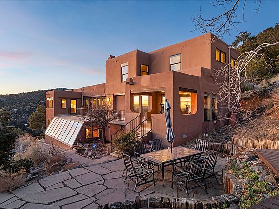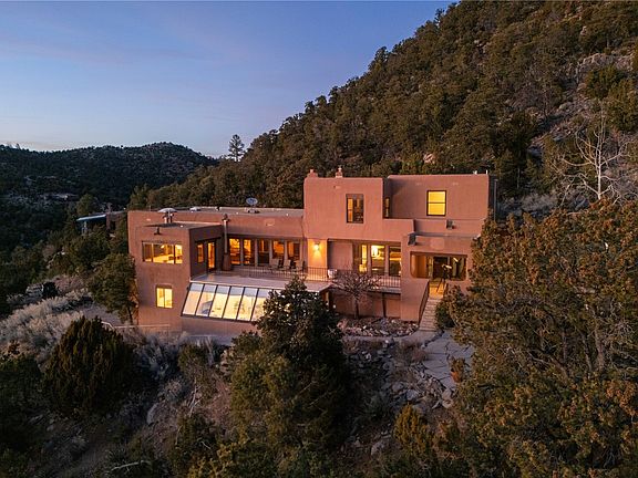 Stunning views, thirteen mountainous acres, an attached guest house, and direct access to boundless trails and National Forest make 39 Overlook an exceptional property. Perched high above Santa Fe just within the gated Overlook subdivision, this multi-level home is designed to savor expansive vistas and inimitable New Mexico sunsets. The over 4,000 square-foot home rises from the mountain side, the 2-car garage at the base, the fully equipped 1BD/1BR casita on the second level, and the main house living levels at the top. Inside the rooms are spacious with oak floors, cherry cabinets, corbels, square cut beams and tongue and groove ceilings. The kitchen enjoys an abundance of natural light with large picture windows framing the expansive basin and mountains beyond. Open to the living room and outfitted with a walk-in pantry and a butler pantry, as well as 6-burner stove, double ovens, counter tops and back splash with artisan tiles, the kitchen will easily accommodate any scale of gathering. The primary bedroom features a corner kiva fireplace and an adjoining sunroom for use as a studio or study, which accesses a covered portal leading to a patio perfect for barbecues and outdoor dining. Two additional rooms on the upper-level function as guest rooms or areas for joint offices, gaming, exercise, art endeavors or study. On the lower level an attached guest house features a wall of glass panels to allow for unobstructed views of the surrounding landscape and passive solar heating. With its own kitchen, dining area, laundry and separate entrance, it is fully self-contained and excellent for guests or as an income generating rental. Here’s an opportunity to live in one of the most beautiful settings in Santa Fe. 39 Overlook is peaceful and private - a castle in the air.