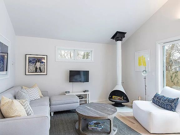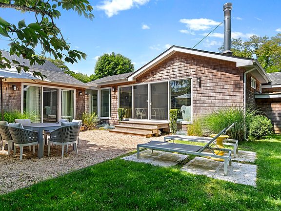 Located on a private road, the home sits on a grassy quarter acre, fenced-in to ensure safety for the whole family. The professionally-designed interior features an open floor plan with high vaulted ceilings and clean, crisp white walls. Tall, large windows surround the main living area, bringing in a ton of natural light. Gather and relax in the airy, bright great room with a cozy mid-century style wood fireplace and a Smart TV. Play lively background music using the Sonos and Bluetooth speaker system. Whip up a delicious breakfast in the spacious, updated island kitchen with quartz countertops, stainless steel appliances, and a wine fridge. Sip coffee brewed with the Nespresso machine at the breakfast area with seating for three. Break bread in the open dining room with a table that seats six and overlooks the backyard. Access the landscaped rear yard through glass doors by the dining area. Perfect for summer entertaining and dining al fresco, the yard features a patio and a charcoal grill. Do a self-guided yoga class and use the weight training equipment in the fitness room. Watch the little ones ride the two children's bicycles on the quiet road.Take the supplied kayak and paddle board to the marina, a short walk away. Strong's Southampton Peconic Bay Marina allows you to rent a boat for water skiing, tubing, fishing, or cruising around in the fresh Hamptons air. Grab the four beach chairs, umbrella, toys, and cooler for a day of fun in the sun at Crab Beach, a two-minute drive away. Retire to the three lovely bedrooms, including the primary suite and two guest rooms that share a bath. In its own wing, the gorgeous primary bedroom suite contains sliding glass windows opening out onto the patio, a walk-in closet, and a master bath complete with spa-like pebble floors, a soaking tub, and a separate shower. For your convenience, a washer and dryer are in the front of the house by the guest rooms. North Sea Bungalow is sure to be the getaway of your dreams.