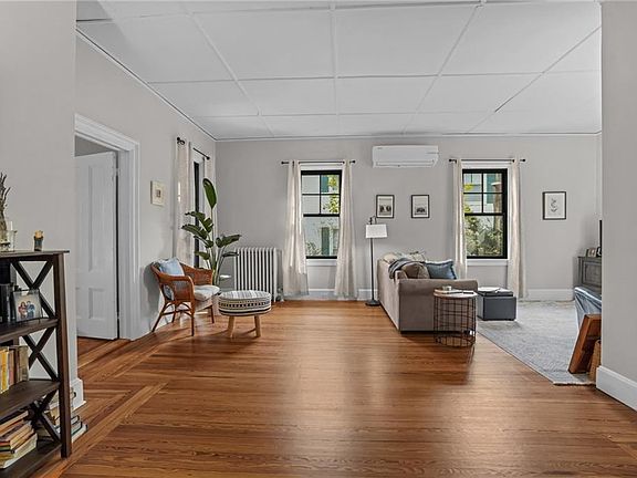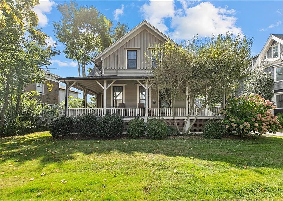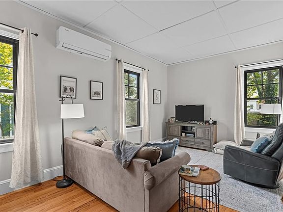 Step into this grand first floor 2-bedroom condo right off of Kay St! This spacious first-floor home offers 1,270 square feet of comfortable living space. The open-concept layout features craftsmanship from a bygone era, including 10-foot ceilings and hardwood floors throughout. A beautifully updated white kitchen with stainless steel appliances and a refreshed bathroom provide modern touches, while newly installed mini-splits offer efficient heating and cooling to complement the classic radiator heat. Floor-to-ceiling black Marvin windows flood the space with natural light and connect seamlessly to the wraparound farmers porch, which is deeded to this unit. The home also includes a deeded rear patio, a large backyard, two dedicated parking spaces and private laundry. With thoughtful improvements, and timeless New England charm, this home is move-in ready and perfectly suited for anyone looking to enjoy the best of Newport living.