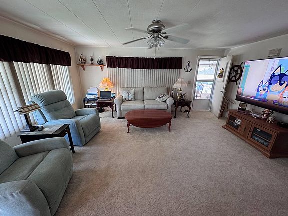 Come and see this beautifully maintained 2-bedroom, 2-bath home located in a friendly 55+ community, offering comfort, convenience, and the perfect Florida lifestyle! As you enter, you'll be greeted by a spacious living room-large enough for all your furniture and a big-screen TV. The open layout flows into a bright dining area, with plenty of space for a large table, chairs, and a china cabinet-ideal for entertaining. The kitchen is thoughtfully designed with ample counter space, a double sink, food pantry, great cabinetry, and modern appliances. Down the hall, you'll find a guest bathroom with a tub/shower combo and a guest bedroom that easily fits a queen bed, sitting area, and closet. The primary bedroom is impressively sized-perfect for a king bed, dresser, and sitting area-with a private bathroom featuring a tub and shower. Outside, enjoy a covered carport, plus a large attached storage and laundry room complete with washer and dryer. The home sits on a corner lot, close to restaurants, shopping, beaches, and main roads leading to local attractions. For those who love the water, you're just minutes from boat launches on the St. Johns River or Lake Monroe-great for fishing or a relaxing day on the water with friends. This home has been very well maintained and is priced to sell at only $39,000. Don't miss your chance to enjoy the retired Florida lifestyle in comfort and style!