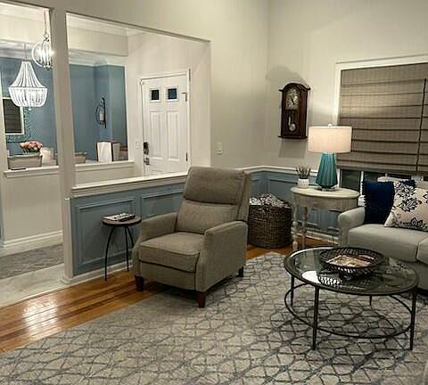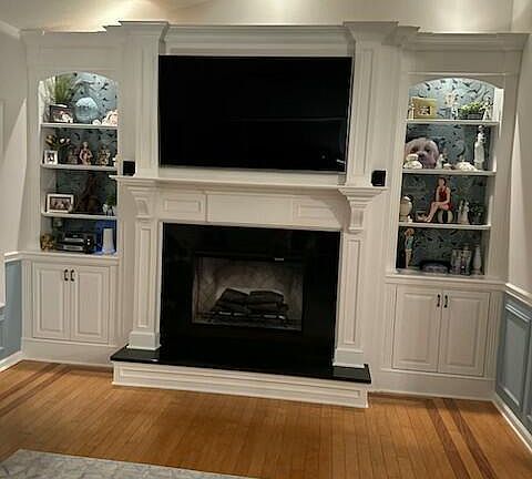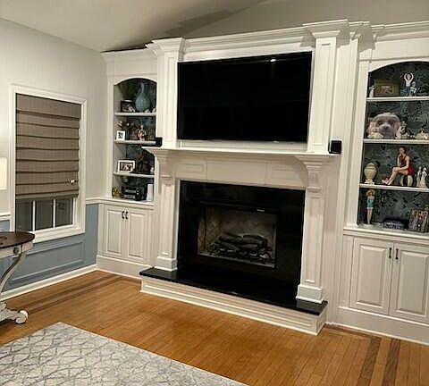 Gas fireplaceRenovated bathsWalk in closetHardwood floorsDirect garage accessBrand new white kitchenDining room