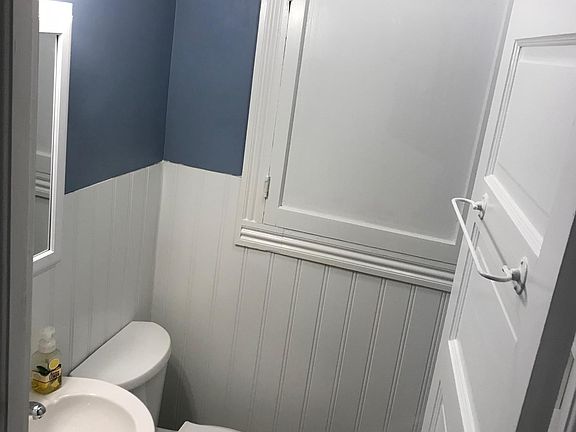 Three-bedroom, one full and one-half bathroom apartment. Each bedroom is on the second floor with closets in all three. The full bathroom is upstairs with the bedrooms. The main floor has a living room, large entry room, kitchen and half bathroom.