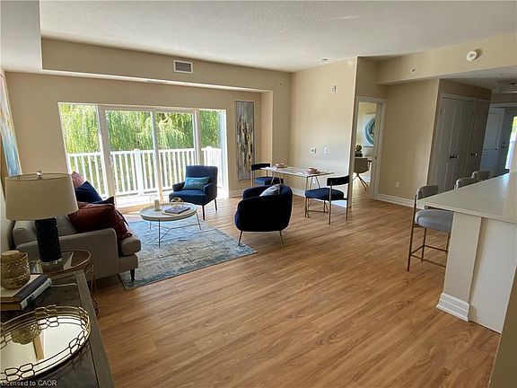 Welcome to the Upper Mill Pond apartments at St. Elizabeth Village, a gated 55+ community offering comfort, convenience, and a vibrant lifestyle. This is one of the largest units in the building at 1,259 square feet and features open concept living with 9 foot ceilings and a modern design throughout. The home includes two bedrooms, a den, and two full bathrooms. The primary suite is a private retreat with its own ensuite featuring a walk-in tiled shower. The kitchen opens seamlessly to the large living and dining area and features a peninsula with seating, perfect for casual meals or entertaining. West-facing windows look directly over one of the Village ponds and provide beautiful sunset views that can be enjoyed from both the living area and the den. There are two balconies, one off the main living space and another off the bedrooms facing northwest, giving you multiple outdoor spaces to relax and enjoy the scenery. Luxury vinyl flooring runs throughout the home, offering both style and easy maintenance. This building offers direct access to a heated indoor pool, gym, saunas, hot tub, and golf simulator. Just a short walk away you will also find a doctors office, pharmacy, massage clinic, and public transportation. The Village is ideally located within a five minute drive to grocery stores, shopping, and restaurants, making day-to-day living simple and convenient. This spacious home combines modern finishes, scenic views, and outstanding amenities in one of the most desirable communities in the area.