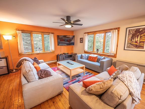 Owners will consider any and all offers! Lovely chalet overlooking the Deerfield River at the north end of Wilmington. Tremendous privacy, light, and serenity, from this riverside retreat just a short drive to Lake Raponda, the village of Wilmington, and Mount Snow ski resort. Inside you are treated to a large open concept floor plan with numerous oversized windows, a large kitchen with breakfast bar, spacious dining area, living room with wood burning stove, den, and wood floors throughout. There are two bedrooms and a full bath on the main floor, as well as a large mudroom entry for gear. In the upper level you will find two large vaulted bedrooms sharing a full bath. The walkout lower level has a large family room, kitchenette, bedroom, bath, and walkout entry. There is a very nice view out over the river and horse fields beyond, as well as a two car detached garage, and large deck for entertaining. Tremendous investment potential or year round personal use. The lower level bedroom does not have legal egress. Likely needs a new roof and deck. Hot tub does not work. The neighbor has unusual fencing up which has been a negative for some buyers but owner is willing to negotiate.
