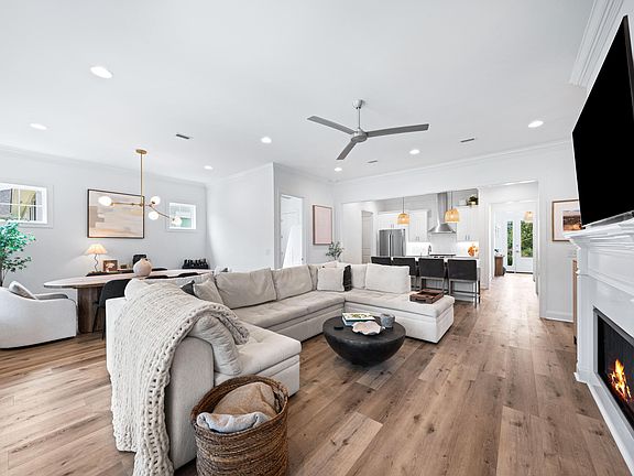This exceptional like new single-story home showcases coastal-inspired design, modern upgrades, and a seamless open floor plan perfect for everyday living or entertaining. Offering 4 bedrooms, 3 bathrooms, and soaring 10' ceilings, every space is thoughtfully crafted with comfort and style in mind.At the heart of the home, the chef's kitchen boasts an expanded quartz island, custom wood cabinetry with soft-close features, and Bosch stainless steel appliances including a gas range with vented hood, built-in microwave drawer, and refrigerator. The spacious living area is anchored by a gas fireplace with custom mantel, while recessed lighting and modern ceiling fans add warmth and ambiance throughout. Upgraded touches continue with custom shelving in all closets and pantry, crown molding and luxury vinyl plank flooring for a polished yet durable finish. Step outside to enjoy an expanded screened back porch with heirloom brick flooring and a private fenced backyard, creating the ideal retreat for both relaxing and entertaining. Additional highlights include a two-car garage, tankless hot water heater, and irrigation system for effortless everyday living.