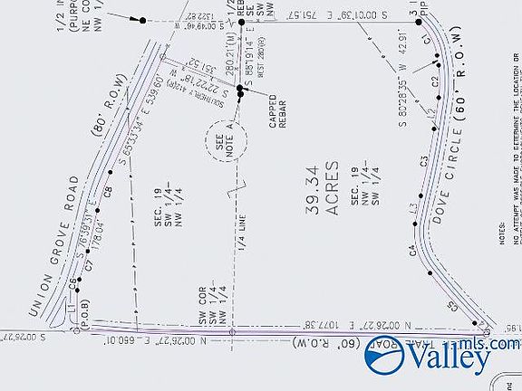 Development land available in Union Grove, Alabama!!! Approximately 39 acres of surveyed & level land with approximately 4,000 feet of paved road frontage on 3 paved county roads, 8" water main along Union Grove Road, access to electricity and cable. No restrictions and no time limit to build or develop. Purchase now for investment or for future plans. Only about a 30 minute commute to south Huntsville.
