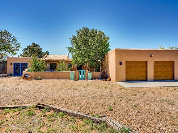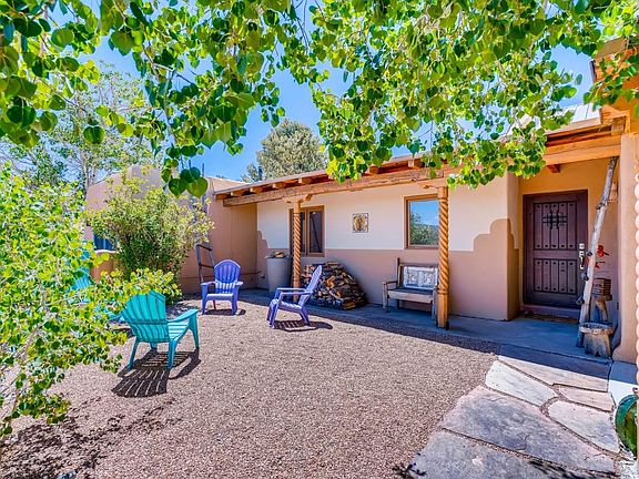 This charming & unique partial adobe Eldorado home is a must see! Kitchen has been fully remodeled, plus the bathrooms have been nicely updated. Brick floors throughout the home with only two short steps down into the living room and one step down into the sunroom. Lots of natural light throughout with clerestory windows, skylights, & solar tubes. Enjoy your morning coffee in the front courtyard or evening drink on the back portal while enjoying the sunset. This home offers several flexible spaces including a heated sunroom, a spacious room with a sink (could be a bedroom/studio/gym/etc.) and a detached studio/guest suite with a 3/4 quarter bathroom. The backyard offers plenty of room to roam, garden and enjoy the beautiful scenery or sit underneath the very large covered patio. The oversized two car garage also allows for additional workspace or storage. **MAKE SURE AND CHECK OUT THE MATTERPORT VIRTUAL TOUR