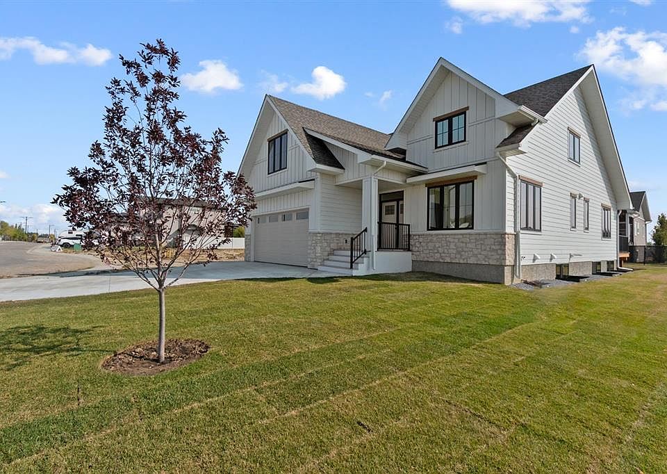 Introducing a beautifully designed, farmhouse-inspired home offering 2,569 square feet of comfortable, modern living. This open-concept residence features four spacious bedrooms and three full bathrooms, providing ample space and privacy for families or guests. Thoughtfully crafted for today’s lifestyle, this home includes a functional layout with timeless appeal. Step into the bright, open kitchen, complete with a custom hood fan, centre island, and a walk-in pantry—a perfect blend of style and practicality. The space is elevated by a variety of custom light fixtures and wall sconces, adding warmth and character throughout. The vaulted ceilings in the dining and living room area create an airy, expansive feel, making it ideal for both entertaining and relaxing. A cozy fireplace with a wood mantle and built-in shelving adds a custom touch and serves as the heart of the living room. The main-floor master bedroom offers a private retreat, featuring a gorgeous ensuite with a double vanity, soaker tub, and glass shower—all designed with luxury and comfort in mind. A huge walk-in closet conveniently connects to the laundry room, enhancing everyday functionality. One of the additional bedrooms offers flexibility to serve as a custom home office, perfect for remote work or study. A large bonus room upstairs provides extra space that can be tailored as a playroom, entertainment area, or a quiet retreat to suit your needs. Located in the charming town of Olds, Alberta, this home combines the best of rural serenity with modern amenities. Known for its friendly community, scenic landscapes, and rich agricultural roots, Olds offers a slower pace of life while still providing access to nature, quality schools, and vibrant local events. Don't miss this opportunity to enjoy the perfect blend of custom charm, functionality, and lifestyle in a home designed for today’s modern family. Call today to book your private tour!!