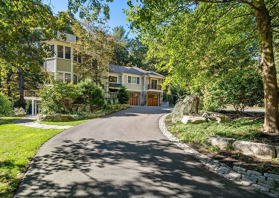 Set in a popular neighborhood this carefully crafted home offers a contemporary style and beautiful views from the private 3+ acres of land yet boasts a walk to all location. High ceilings, spacious rooms, open floor plan and walls of glass allow natural light to beam throughout. There are three finished floors of living space to accommodate multi generations. Move in ready this home recently went through extensive renovations offering a natural flow for entertaining or just enjoying with family and friends. Expanded kitchen with large island, dining room, family room with vaulted ceiling has access to the back deck. There is a guest room/office, full bath, laundry room, mudroom, heated garage complete first floor. Second floor hosts the spacious primary with loft and spa like bath, good sized additional bedrooms, custom library with builtins. The lower level has a rec room, full gym, guest bedroom, full bath and kitchenette, addtl egress and opens to a patio and manicured back yard