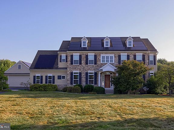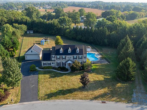 This stunning Garman-built Colonial sits on a private 1.5-acre lot in the back corner of Shadow Creek, one of Lebanon county's finest communities. Built in 2013, this home offers over 3,700 sq. ft. of living space. The first floor stuns with 9 foot ceilings, office space and a coffered ceiling dining room. The kitchen is both beautiful and functional with dark cabinets and stainless steel appliances. Other features include an open family room, gas fireplace, first floor laundry and a half bath. Upstairs you have your large primary with tray ceiling and en suite bath featuring double sinks, stall shower and large soaking tub. 3 other large bedrooms and full bath round out this upper level. All bedrooms have walk-in closets and ceilings fans. Looking for some additional living space? Step downstairs to the finished daylight basement. Here you'll find a 5th bedroom option and a full bath (3.5 total baths). Built-in bar area and rec space make this a popular hangout year round. Outside is just as impressive. Summer extends in your heated 30,000-gallon saltwater gunite pool with vinyl liner, built-in hot tub with spill way, and a sliding board. A spacious paver patio, pavilion with bar and grill, natural stone countertops, pool house, and fire pit create the perfect entertaining space—all within a fully fenced yard. A large deck, shed and playhouse complete this exceptional backyard. The detached garage adds two additional garage spots (5 total) and a partially finished loft/flex area upstairs. Energy-conscious buyers will appreciate the owned solar panels. Sleep well at night knowing the indoor air quality is healthy and clean with your whole home air purifying system. If you're looking for a large lot, swimming pool, finished basement and plenty of garage space, this home is for you. Schedule your showing to see this lovely home now.