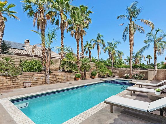 SELLERS TAKING BACKUP OFFERS!Small, quiet gated community in Rancho Mirage with low HOA dues! A beautiful home on on a large private lot with backyard mountain views. Large sparkling private pool and spa area with low maintenance concrete decking and the perfect amount of sun! The home has Two Master Bedrooms with ensuite baths and generous walk-in closets, custom interior shutters, Manufactured wood flooring in all bedrooms, 17 ft. high ceilings in the Great Room, a chefs kitchen with ample countertops, plenty of seating capacity and a walk-in pantry. Indoor full laundry room with a 3-car attached garage, solar window screens, and mature water efficient landscaping with many Mediterranean fan palms. White Sun Estates is a hidden gem in Rancho Mirage consisting of 52 homes which seldom come on the market. Centrally located to exclusive Rancho Mirage and Palm Desert/El Paseo shopping and restaurants. Drive within minutes of The River, COD, McCallum Theatre, Palm Springs Airport and hiking trails.