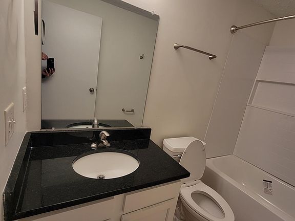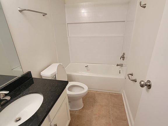 White subway tile backsplashNew paint throughout propertyVanity with granite topRenovated bathroomTile floorsNew hardwood lvt flooringBlack granite counter tops