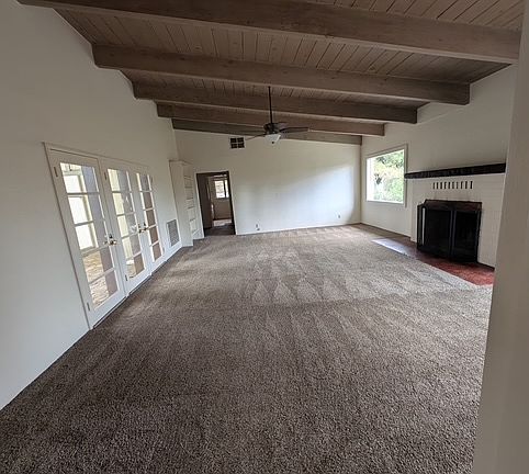 This home, which sits on approximately 2 acres, features a wide hallway with a storage closet and shelves. Large eat-in kitchen, stainless steel sink, refrigerator, ample cabinet space and a large utility room off the kitchen with a half bath. Large wrap around deck just off the kitchen. The living room features high wood beam ceilings, fireplace with picture windows on either side and French doors leading out to a Cobblestone patio. The primary bedroom has wood beam ceilings, three windows for plenty of natural light, a closet with mirrored doors and built-in drawers. One large bathroom off the hallway features lots of storage and two sinks with cultured marble top.