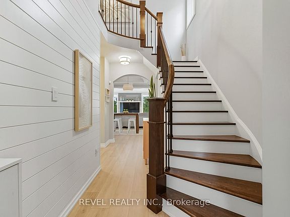 Private backyard oasisStatement-making staircaseChef-inspired kitchenSleek caesarstone countertopsElegant nuvolato marble backsplashFormal dining spaceCustom plaster crown moulding