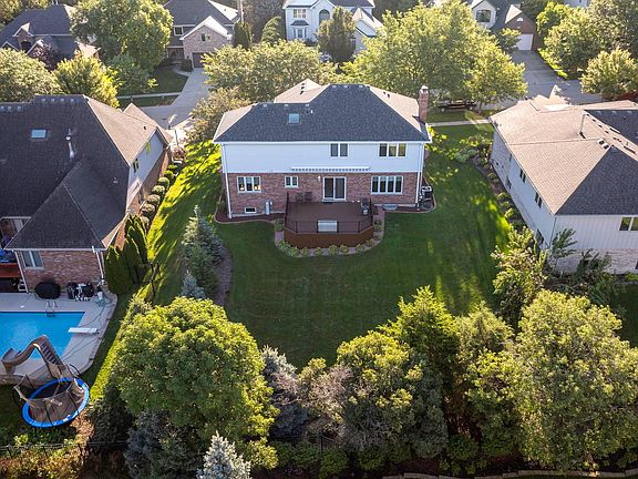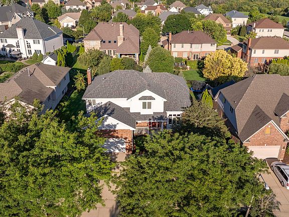 Custom-built original owner home nestled on a mature tree-lined street offered for the first time in the sought after Hirsekorn Ridge Subdivision! This extremely well taken care of Blarney Model property built by local builder (A&J Construction) checks all the boxes! Light, bright, neutral and move-in ready! The large eat-in kitchen has updated granite countertops with travertine backsplash and a spectacular view of the lush backyard with mature trees including beautiful blue spruces. The adjacent family room has a cozy brick wood burning fireplace with gas starter. The dramatic cathedral ceiling living room leads into the dining room for entertaining on those special occasions! The convenient half bath on the main level has updated matching granite that flows from the kitchen. All 4 bedrooms are upstairs. The primary bedroom has a walk-in closet and updates include granite countertops, whirlpool tub granite surround, and walk-in shower. There is an additional full bathroom upstairs with a Velux skylight for the other 3 bedrooms to share. Updates include:Roof 2019, gorgeous 24X16 Trex deck with black aluminum railing 2022, HVAC and smart thermostat 2022, Marygrove remote control awning with lights on back patio 2024. The clean 2.5 extra deep garage boasts a 12ft 3in tall ceiling with insulated door serviced every year. Great space for a pulley system to store boats, kayaks, etc. Full unfinished basement for extra storage. Basement has rough-in for bathroom for future finishing plans if desired. Excellent Lemont location near Northview Park with splash pad, award winning schools, Historic Downtown Lemont, shopping, biking trails, all major expressways, Metra train to Chicago, The Forge Adventure Park and more!