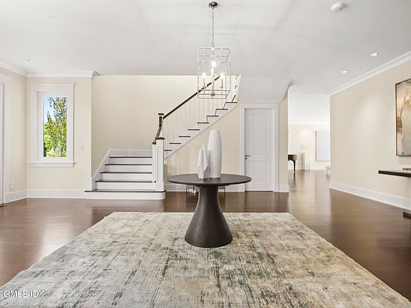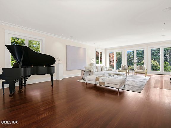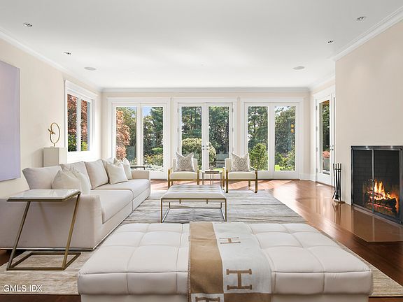 Chic European inspired home fronted by a gracious courtyard is secluded at end of a long, gated drive on one of the highest points in Greenwich. Striking modern architectural elements enhance the sophisticated 10,000+ sf interior with distant L.I Sound views from top floors. Grand scale living and dining rooms; custom offices; sleek Snaidero Italian gourmet kitchen with 6'x8' stainless center isle; breakfast room with double fireplace serving adjoining family room. Broad floor-to- ceiling windows frame the horticultural splendour of a glorious outdoor palette with heated pool, gorgeous gardens, trees and evergreen hedgerows. Multiple French doors open to covered terrace spanning the rear. 7 bedrooms, including the fabulous 3-exposure, 1,200+ sf primary suite with fp, Juliette balcony and