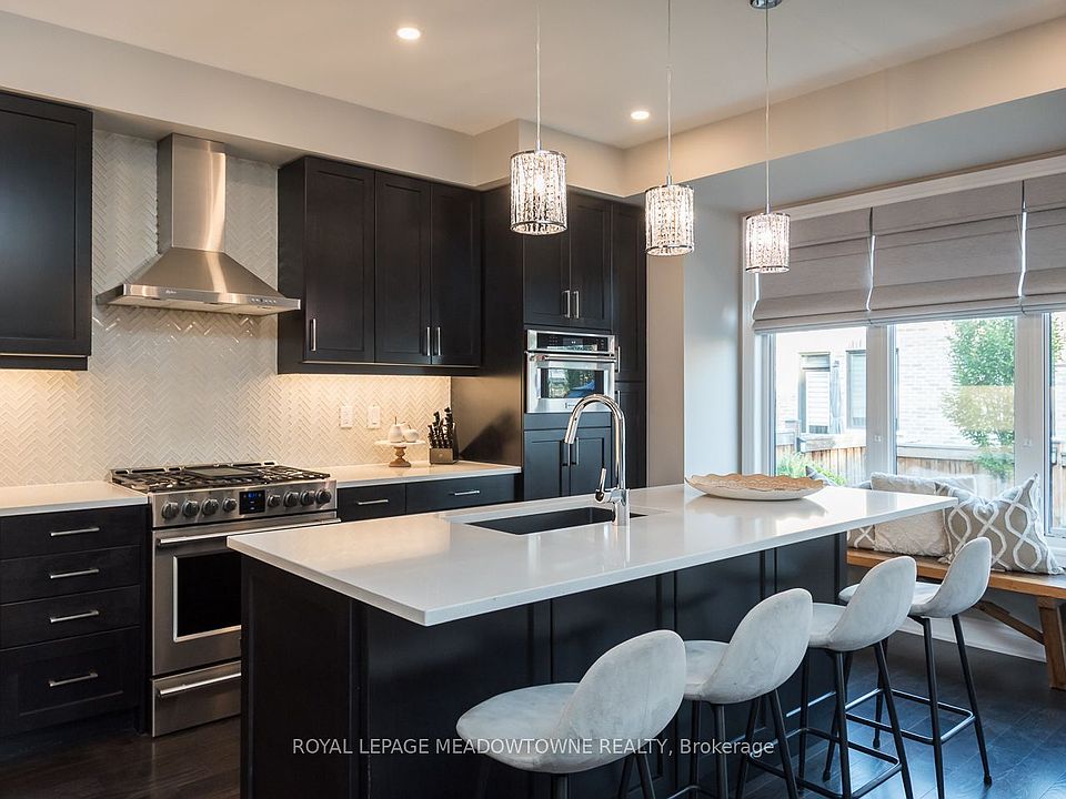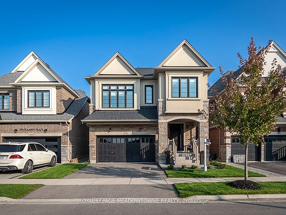 Offering nearly 3500sqft of beautifully designed living space, this Great Gulf Sinclair Model is nestled on a family-friendly street in the heart of Milton's desirable Ford neighbourhood -- a place where your family can grow, gather, and celebrate life's milestones. From the moment you step inside, soaring 10-foot ceilings & rich dark hardwood floors set the stage for both elegance and warmth. The extended, upgraded kitchen, with its striking dark cabinetry, quartz countertops, stainless steel appliances, & spacious island, isn't just a kitchen; it's the heart of the home. Picture morning breakfasts with the kids, holiday dinners with loved ones, and late-night laughter with friends, all unfolding in this inviting space. The open-concept living room, anchored by a stunning limestone gas fireplace, and the dining area with room for everyone, make everyday moments feel special. Upstairs, a versatile family room/den/office adapts to your needs, whether it's a quiet study space, or a playroom for little ones. Four generous bedrooms offer comfort and privacy for the whole family, while the primary suite is a retreat all your own, with dual walk-in closets & a spa-like ensuite designed for relaxation. Step outside to your private backyard oasis professionally landscaped with irrigation, lush greenery, & a hot tub, creating the perfect backdrop for summer BBQs, evenings under the stars, or simply unwinding after a long day. The fully finished basement adds even more room to grow. With a large recreation area, a wood-accent wall, electric fireplace, wet bar, & plenty of natural light, it's a space designed for game nights, celebrations, or quiet family time. Every detail has been thoughtfully chosen from 200-amp electrical, EV rough-in, to smart home features, a secure fibreglass front door, and a double garage with mudroom access - all blending modern convenience with timeless comfort. This isn't just a house. It's where your family's next chapter begins.