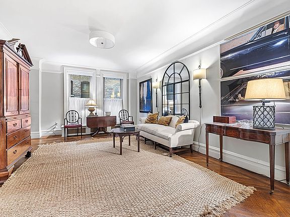 This elegant home melds prewar grandeur with first-class renovations. Its chestnut stained oak plank and herringbone floors are in pristine condition, along with tasteful, soft lighting throughout. The large living room is notable for its unique, 7-foot tall twin windows framed by museum-quality valances, chain roller shades and privacy curtains. The eat-in chef's kitchen has Pietra Cardosa (deep blue grey hue) countertops, a 30” Liebherr refrigerator, Wolf convection and steam oven, a Viking gas range and frosted, glass-fronted cabinets. The bright and spacious bath has a step-in, beautifully tiled shower with a floor-to-ceiling glass enclosure. The fixtures are by Kohler and Waterworks.