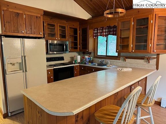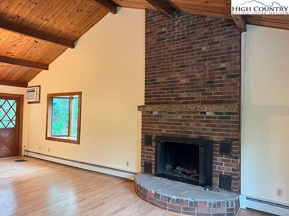 Charming and rustic cottage nestled in a wooded setting just 15 minutes to Boone! Interior features a large living/kitchen/dining area with floor-to-ceiling wood-burning fireplace. The basement has a workshop and finished area that is not included in heated basement area due to low ceiling height. Basement area also features a fireplace, wood stove, plenty of built-in storage, bedroom, bath and kitchenette. Large outbuilding/patio with concrete floor.