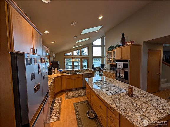 Amazing waterfront home on Hammersley Inlet. Stunning 180-degree view of Oakland Bay. Watch the occasional orca swim by. Dramatic living room with vaulted ceiling. Nearly every room in the house has a magnificent view. Very light and bright with newer windows throughout. New skylights as well.  Kitchen features beautiful granite counter tops and maple cabinets. There is a large master bedroom on the main level with a master bath attached. Enjoy the 57,064 sq ft lot with a covered porch, large deck, firepit, chicken coop, orchard, outdoor shower and a beach with kayak rack so you can be ready to hit the water. The family room upstairs could double as a 3rd bedroom. The second bedroom/office is missing a closet. Toilet and sink in the garage.