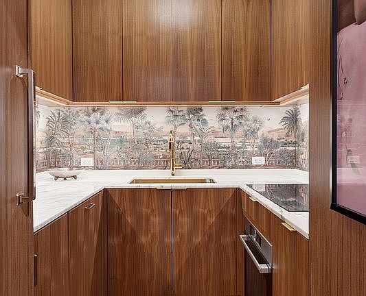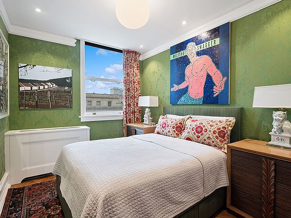 A gracious foyer flows into a 16' 9" x 15' Great Room, which is bathed in spectacular light from 2 oversized windows facing west. This room showcases 24 inch Parquet de Versailles handled wood flooring, 8' 9" ceilings and is punctuated by a Calacatta Viola marble mantel. One feels as if they have stepped into a chic Parisian apartment. The kitchen is finished in sleek walnut custom cabinetry, Calacatta Gold countertops and top of the line appliances - Sub Zero refrigerator, Bosch dishwasher and induction stove with a brass pot filler. A hallway, with hand printed de Gournay wallpaper, leads to the bedroom and bathroom. The bedroom has an oversized west facing window and large walk in closet. The bathroom features a floating walnut vanity with Calacatta Gold countertop, dual sink, separate stall shower with LeFroy Brooks fixtures and a Toto toilet. The home is complete with central AC, an LG washer dryer, fabulous Flos and Foscarini lighting fixtures and a large coat closet in the foyer. Pied a terre and pet friendly. The 12th or penthouse floor offers direct access to a huge building terrace just down the hall, wonderful for dining al fresco, entertaining or just soaking up the sun.