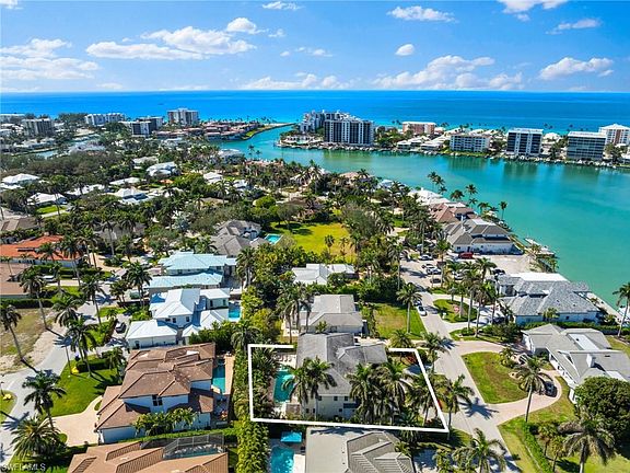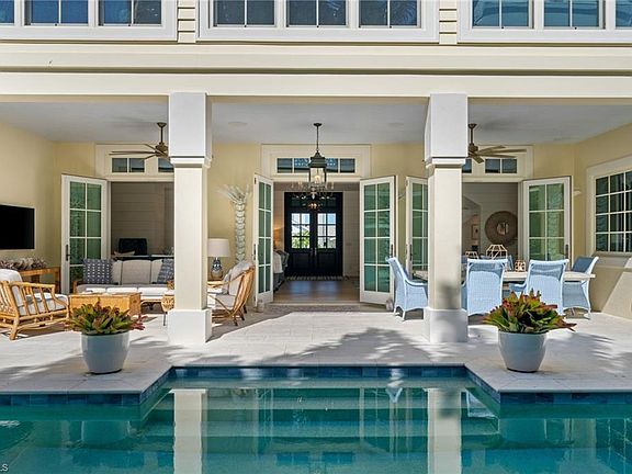 Designed, built, and decorated by a renowned interior designer, this stunning four bedroom, five bathroom estate blends timeless Southern charm with modern luxury. The interior of this home has remained completely unaffected by hurricanes or flooding, with no water intrusion to the interior during any storm event. Boasting two master suites, one on the main level and another upstairs, both feature spa-like ensuite baths with heated floors for ultimate comfort. Step inside to an awe-inspiring great room with soaring ceilings, seamlessly flowing out to a screened in lanai that overlooks an oversized resort style pool, complete with a sun shelf and spa. Custom wide plank oak flooring by Legno Bastone enhances the warmth and elegance of every space. At the heart of the home, the chef designed kitchen is a culinary dream, outfitted with a gas Wolf range, SubZero refrigeration, two beverage drawers, a warming drawer, two dishwashers, and a built-in microwave drawer. A banquette, oversized island, and formal dining area provide multiple dining options, while a nearby wet bar with a wine fridge adds convenience. Outdoor living is equally impressive, featuring a fully equipped summer kitchen, pool deck dining under the stars, and a screened in dining area, all protected by forty two SWAT Mosquito sprayers. Upstairs, discover two additional spacious ensuite bedrooms and a versatile family room that doubles as a sleeping porch for family sleepovers. This home also includes two oversized garages, a custom laundry room with a second refrigerator, sink, and standalone Scotsman ice maker, a Kinetico water filtration system, a Sonos sound system, Lutron smart lighting, and WiFi controlled heating and cooling. Built with solid concrete walls, steel beams, and a poured concrete second floor, this residence offers exceptional durability and safety. Thoughtfully designed to create a sanctuary of comfort, style, and security, this home is truly one of Naples’ finest residences.