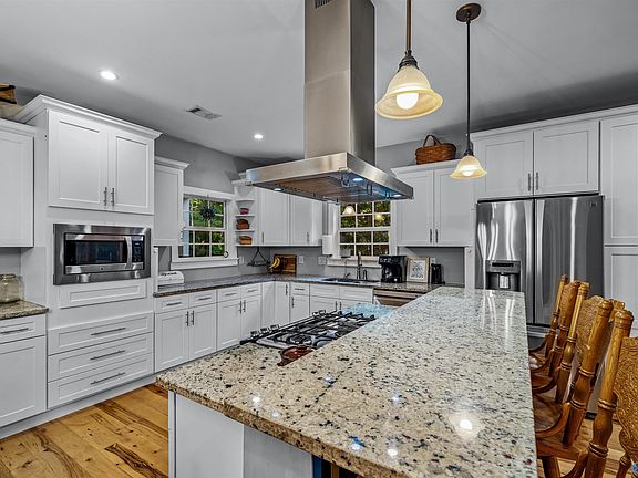 Pole barnWood-burning fireplaceHot tubHickory wood floorsCovered front porchLarge covered rear deckFire pit