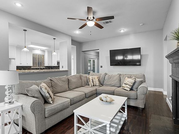 Nestled on a picturesque corner lot surrounded by mature trees, this inviting 3-bedroom, 2-bath home with a private office perfectly blends warmth, comfort, and convenience. Recently refreshed with a new roof, new gutters, and fresh interior and exterior paint, the home feels both timeless and renewed. Just one house down from the community pool, it offers a lifestyle of ease and connection. Inside, beautiful wood floors extend through the main living areas, office, and bedrooms, setting a warm tone throughout the home. At the front of the home, a dedicated office with elegant French doors provides a quiet space to work or study. Toward the back, the open-concept kitchen, dining, and living spaces flow together effortlessly—perfect for everyday living and gatherings alike. The kitchen is as functional as it is beautiful, featuring an abundance of white cabinetry, granite countertops, a spacious island, stainless steel appliances, a gas range, and a breakfast bar overlooking the living room—ideal for entertaining or family time. The cozy living room, complete with a charming fireplace and windows framing views of the spacious backyard, is the heart of the home. The primary suite offers a peaceful retreat with two walk-in closets, plus an ensuite bath featuring dual sinks, a garden tub, and a separate shower. Two additional bedrooms and a full bath are thoughtfully split from the primary, offering comfort and privacy for family or guests. Step outside to enjoy the covered patio and expansive grassy yard, fully enclosed by an 8-foot board-on-board fence—perfect for relaxing, gardening, or play. Located just a two blocks from the elementary school and minutes from shopping, dining, and I-35E, this home combines small-community charm with everyday convenience. It’s a place where warmth and practicality meet—ready to welcome you home.