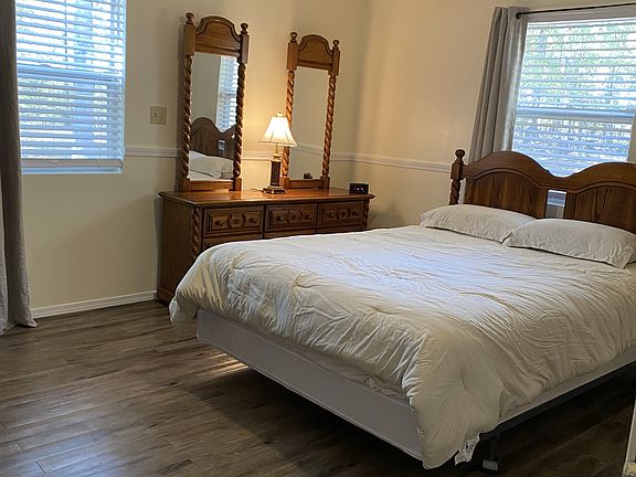 Master bedroom with a queen sized bed includes 50" Roku tv with dvd & VHS players, walk in closet, extra pillows, blankets & linens, blackout curtains, master bathroom with jetted tub, bidet.