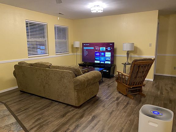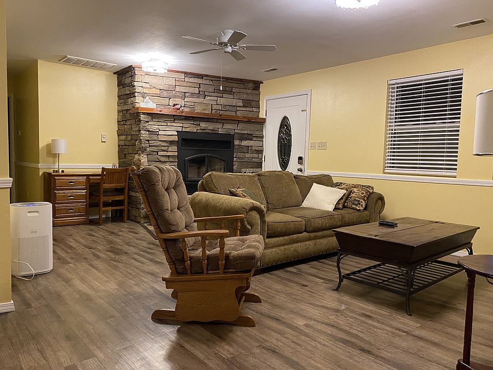 Living room consists of couch, glider chair, 65" Roku tv, dvd player with several dvds to choose from, stone fireplace, work desk with monitor, HDMI cable, & usb charging ports.