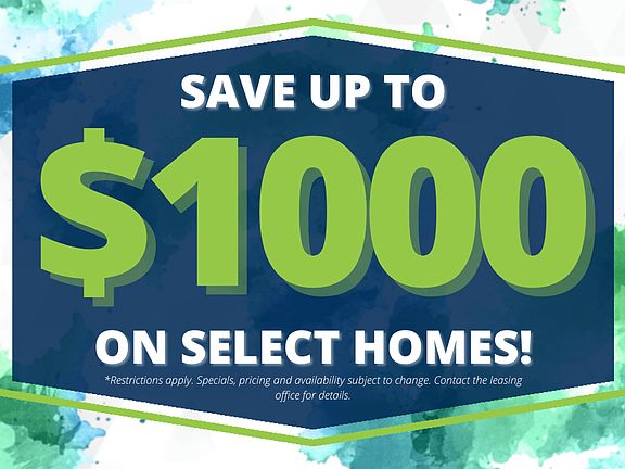 - Special offer! Save up to $1000 on select homes! *Restrictions apply. Specials, pricing and availability subject to change daily. Contact the leasing office for details.