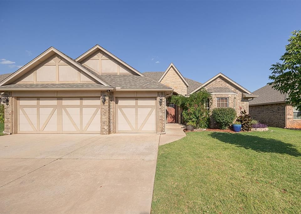 Welcome to your dream home in Southeast Edmond! This beautifully updated 4-bedroom, 2-bathroom home offers the perfect blend of comfort and style. From the manicured curb appeal and 3 car garage, the home in the Landings at Stonebridge stands out. Step inside to discover an inviting open concept living area, complete with wood floors in the main living, vaulted ceiling and fireplace anchoring the room. The spacious kitchen boasts updated countertops, stainless steel appliances, and ample cabinet space, making it a chef's delight. The split floorplan allows for room to spread out and plenty of privacy. The spacious primary suite leads into the master bath with a double vanity, separate shower & tub and roomy closet. The office or additional bedroom, give the perfect workspace or guest room. Step outside to the covered back porch with TV, extended patio and a storage building. Enjoy the neighborhood pond and proximity to I-35 and the turnpike. This one won't last long!