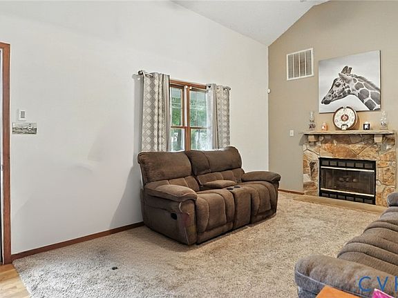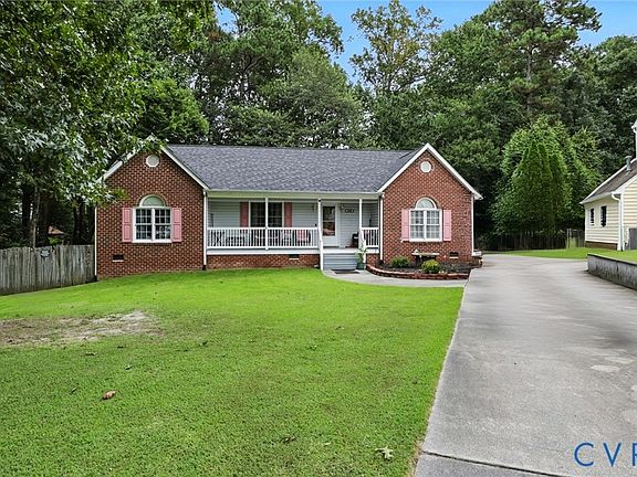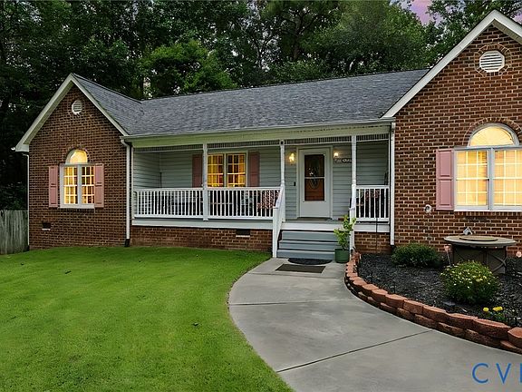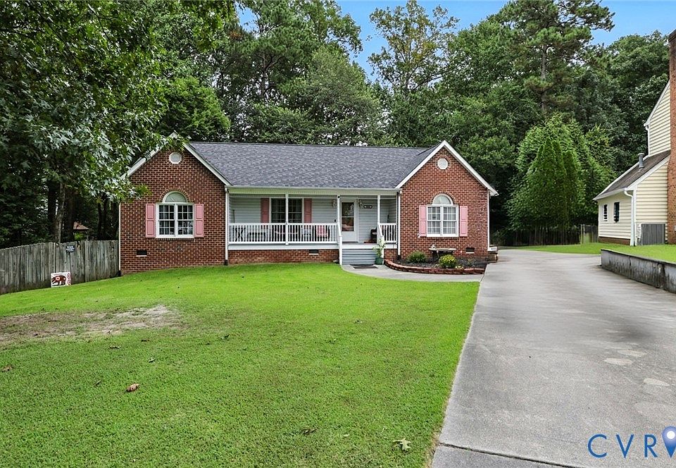Welcome home to this beautiful 4-bedroom, 2-bath brick ranch-style home nestled in the Cheshire community of Chesterfield County. This home boasts a newly painted front porch, creating a welcoming and refreshed impression! Step inside and gaze up at the 12-foot ceilings with built-in surround sound speakers! Imagine cozy evenings spent by the beautiful stone gas fireplace, creating a warm and inviting atmosphere throughout the home! Freshly shampooed carpets throughout the entire home! Underneath the living room and hallway carpet is hardwood flooring perfectly preserved for the next homeowner! Check out the beautiful composite decking in the backyard overlooking the woods! With freshly painted interiors and beautiful hardwood cabinets, this home is truly move-in ready and requires no immediate updates. Hot water heater(2017), Gas Heat(2017), Central Air(2022), new pull down attic door with aluminum steps(2023), New Roof(2020)! Schedule a tour today of this beautiful home!