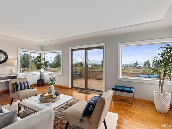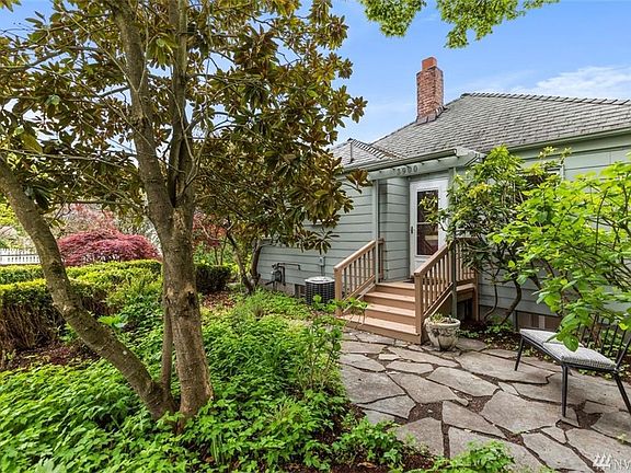Light-filled Cap Cod with Sound and Mountain Views on a quiet tree-lined street. Filled with both old-world charm and updates, this 3 beds+loft home boasts wood floors, coved ceilings, expansive windows, fresh paint & new carpet. Relax in spacious living room w/ entertainment sized deck watching Sunsets. Finished lower level w/ separate entrance for multiple possibilities MIL/AirBnb? Large corner lot is gardeners paradise and offers backyard cottage/DADU potential. Huge 2 car garage off alley.