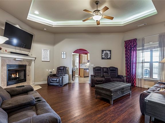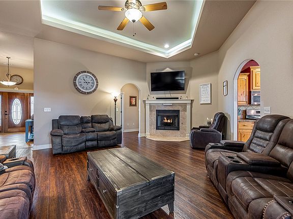 Welcome to this stunning custom-built home, where a floor-to-ceiling entryway floods the space w/natural light, creating a warm & inviting atmosphere. The living room features lit double tray ceilings, a gas fireplace, & wood floors. The kitchen boasts a gas range, custom backsplash, solid wood cabinets, & an eat-in dining area. Host gatherings in the formal dining room, complete w/a custom-built sideboard & extra storage. The primary suite offers a serene retreat w/ lit double tray ceilings, a flex space w/backyard access, soaking tub, custom walk-in shower, & a spacious closet. Two additional bedrooms w/ oversized closets, a full bath, & a ½ bath are located on the opposite side for privacy. Step outside to enjoy the covered patio, landscaped backyard, & pergola—perfect for relaxing or entertaining. New Roof in 2022. Cornerstone Ridge offers 17 acres w/a community pool, playground, fitness trail, fishing ponds, & paved trails. Just 15 minutes to XNA, Walmart HQ, and I-49, this home blends charm with convenience.