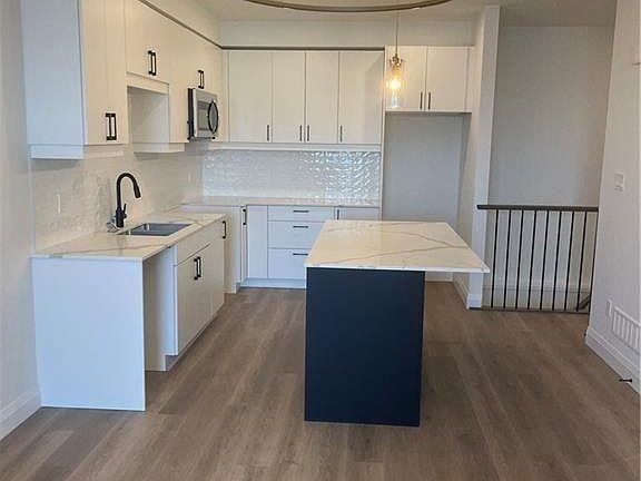 Open-concept main floorSleek kitchenQuartz countertopsContemporary cabinetryQuiet newer development