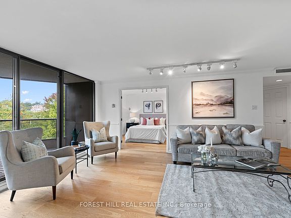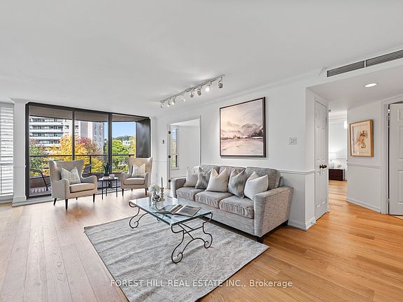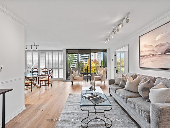 Welcome to this spacious & gracious suite at coveted York Mills Place. This charming home of approximately 1240 sf with no wasted space, offers the perfect setting for a simplified lifestyle without compromise. Wall-to-wall windows with walk-out to the balcony fill the home with natural light, including the open concept kitchen with urban & treetop views. The versatile 2nd bedroom complete with frosted glass French doors & closet, offer maximum versatility as a true 2nd bedroom or as an extension of the living room for your office, yoga studio or creative hobby area. The primary bedroom features a walk-in closet, ensuite & custom built-ins to maximize storage. The walk-in laundry/utility room includes a heat pump to individually control the temperature in your suite. Downsize or right-size in style while enjoying the space & comfort you value.The suite is well located within easy proximity to the elevator & 1 of the 2 parking spaces is on the 4th floor for maximum convenience.The hallways & other common areas are under renovation for a contemporary, sophisticated & fresh update.