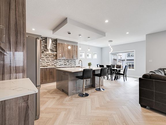 Prepare to be impressed by the stunning HERRINGBONE flooring throughout, setting warm and welcoming tones as you walk in. Offering over 4,000 sqft of serious comfort, function, and luxury. The main floor features 17 ft ceilings with an open concept kitchen, perfect for entertaining, while the FULLY FINISHED basement includes a WET BAR, generous rec room, cozy fireplace, and two additional bedrooms—ideal for guests or a growing family. A SEPERATE SIDE ENTRANCE adds convenience, and the HEATED TRIPLE car attached garage offers both space and comfort year-round. Stay cool with central AIR CONDITIONING, and retreat to the luxurious primary suite with a spa-like bathroom, complete with a jetted tub, tiled shower, and large walk-in closet. From top to bottom, this home is full of upgrades and personality—truly an awesome place to call home.