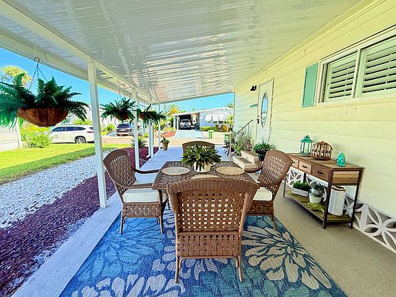 Move-in ready 2 bedroom, 2 bath home on a desirable corner lot in Seabreeze Mobile Estates, a 55+ community offering an active Florida lifestyle. This fully furnished home (minus some accessories) has been beautifully updated with LVP flooring throughout, new bedroom floors, plantation shutters, updated kitchen with laminate countertops, new sink faucet, washer/dryer, and all appliances included. Enjoy the spacious year round sunroom with new windows. Large bay window in living room area. Recent improvements include a new HVAC system (2024) plus a new covered carport and storage shed for added convenience. Seabreeze Mobile Estates is a well-maintained community featuring a swimming pool, tennis courts, shuffleboard, and a clubhouse with organized activities and social events. Residents enjoy a friendly, welcoming atmosphere with low-maintenance living. The monthly lot rent is just $706 and includes trash service. Please note this is a 55+ community, no pets are permitted (service animals only), and rentals are not allowed.